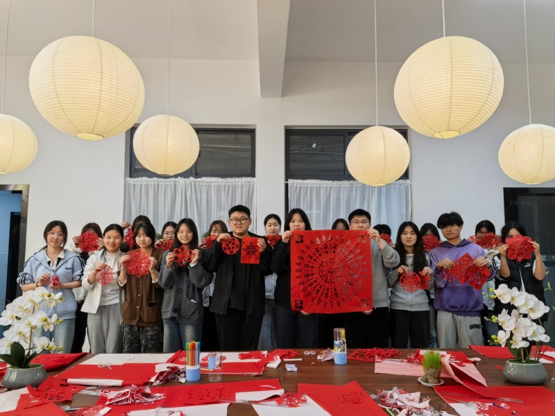 图为学生在东园“一站式”学生社区参加“剪纳山河,心铭家国”爱国主义主题剪纸体验活动