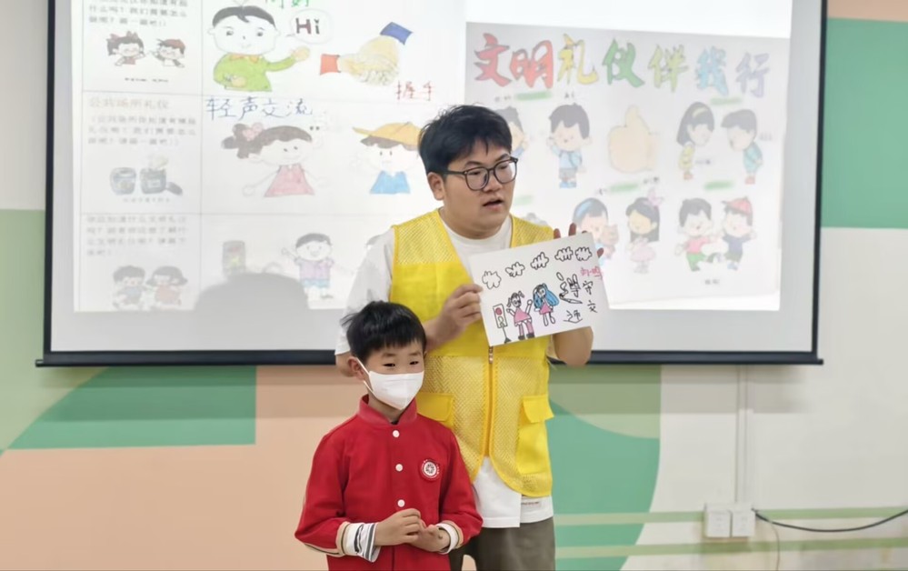 作为第二季的首次活动,本期课堂在总结第一季经验的基础上,对内容和形式进行了优化升级。活动开始,文化与旅游学院的学生志愿者以一段生动的礼仪起源动画视频引入主题。志愿者从中国古代的作揖礼讲起,结合PPT与短视频,向孩子们讲解了礼仪的起源与发展,并通过校园、家庭、社区等日常场景,介绍了礼仪的基本分类与重要性。在“礼仪小精灵”与“淘气小捣蛋”的正反对比角色扮演环节,孩子们积极参与,直观感受到文明行为带来的积极变化。实践环节,志愿者们组织“礼貌传递接龙”和“小树苗比赛”等趣味游戏,引导孩子们在游戏中练习见面问好、接受帮助后致谢、主动道歉等基本礼貌用语。现场笑声不断,孩子们在互动中巩固了“请”“谢谢”“对不起”“再见”等文明用语的正确使用场景。