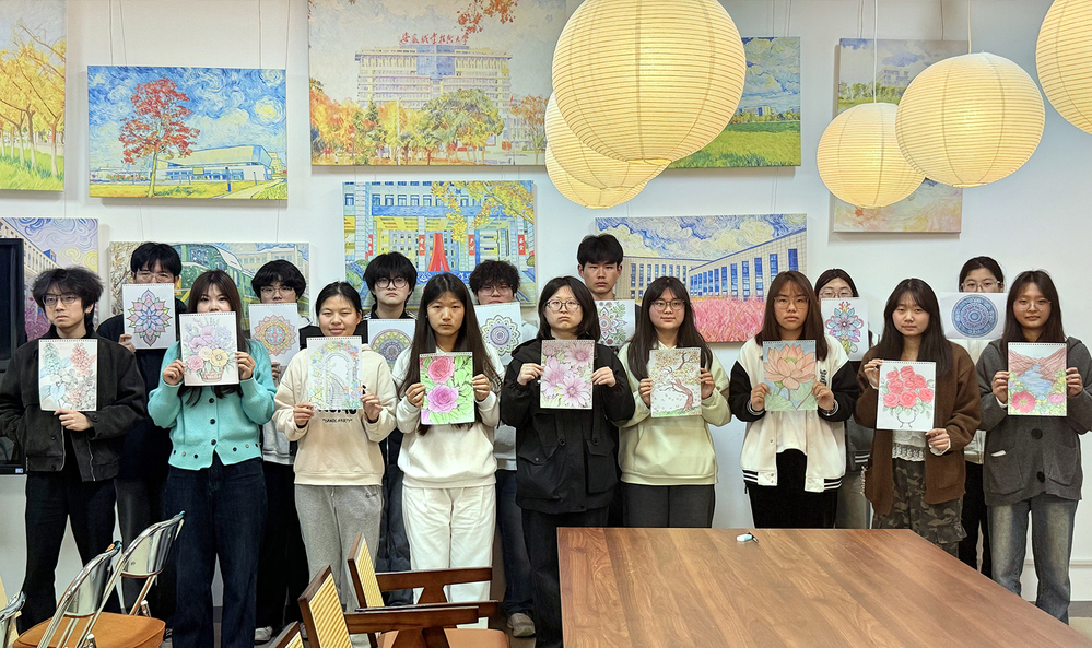 沉浸体验,专注赋能强秩序。活动以“专注力提升与内在秩序修复”为核心目标,设计“静观觉察—自由创作—命名分享”三阶递进式心理育人流程。主讲教师首先阐释艺术疗愈的心理学意涵,带领学生通过呼吸静观练习进入觉察状态。在40分钟自由绘制环节中,学生专注调配色彩、填充图形,情绪在创作过程中自然流动,注意力在重复中获得稳定锚定。活动采用前测-后测问卷设计,量化评估干预效果。