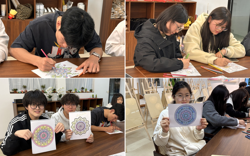 美育润心,艺术疗愈促整合。工作室以荣格心理学象征理论为支撑,融合艺术疗愈与正念实践,精心设计结构化图形绘画活动。学生在画纸上自由涂绘,不设技法要求,不进行比较评价,通过色彩调配与图形填充获得安全、低防御的情绪释放通道。绘画过程本身成为一种低唤醒水平的心理调节技术,有效减少思维涣散、缓解焦虑体验。