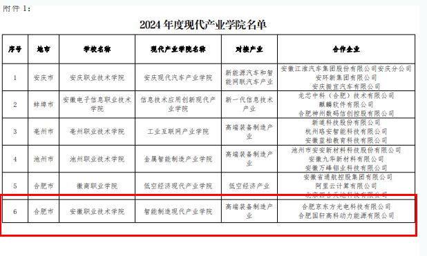 共建实体化产业学院。当前学校与京东方、国轩高科、比亚迪、蔚来等头部企业共建1个现代产业学院,覆盖智能制造、新能源汽车、新一代信息技术等重点领域,形成“一专业群一产业学院”的全覆盖格局,其中智能制造现代产业学院获批2024年度省级职业院校现代产业学院。