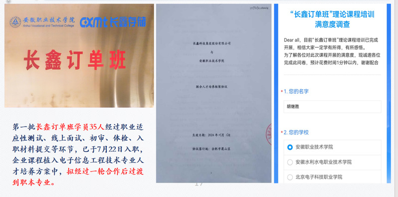 开展“订单式”人才培养。学校与长鑫存储开展订单班培养,每期培养35人;与戴姆勒大中华区投资有限公司组建“奔驰”班,每期培育学生40人;与安徽迪科数金科技有限公司共建“天源迪科学院”,成立“安职金服班”,近100名学生通过该班完成就业。与蔚来汽车(安徽)科技有限公司签署校企合作协议,开办“蔚来班”,为公司输送高技能人才200余人。