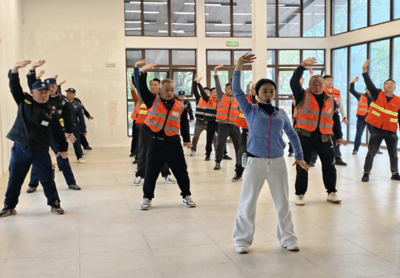 本次活动紧扣“服务一线、保障民生”目标,体育健康学院依托运动健康、体能训练专业优势,聚焦一线职工长期户外劳作,易出现肩颈、腰背劳损等健康问题,创新“送教上门、服务到岗”模式,开展规范化八段锦教学。阎景慧、张茜、李玲三位老师现场示范动作、讲解健身原理、手把手指导练习,帮助职工掌握科学养生方法,有效缓解身体劳损,提升自主健康管理能力,赢得职工一致好评。