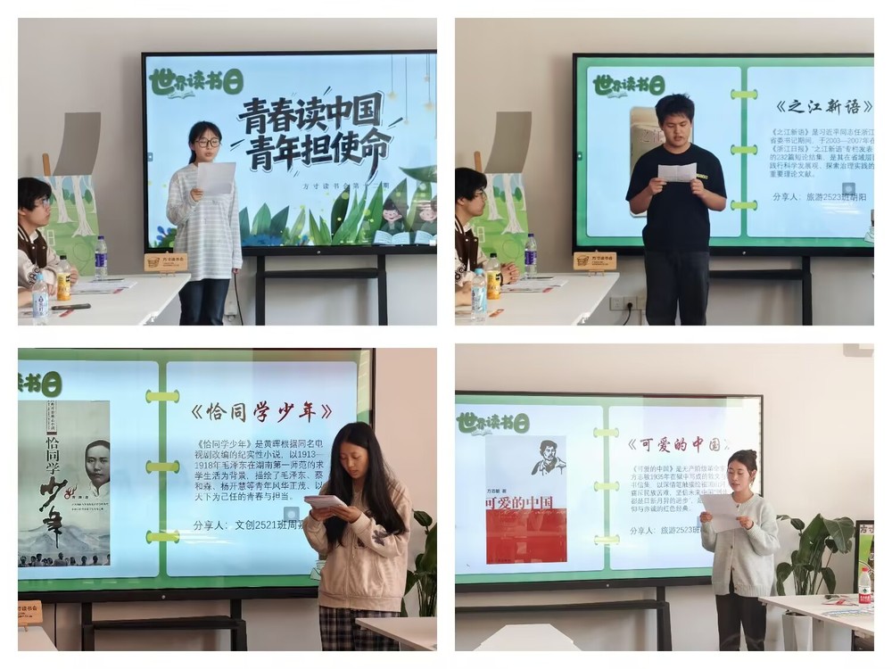 活动伊始,读书分享环节正式拉开帷幕。同学们立足经典著作,结合自身学习与生活感悟,畅谈读书心得。旅游2523班胡阳同学深入分享《之江新语》,从书中汲取思想智慧与实干精神;文创2521班周嘉林同学以《恰同学少年》为引,追忆青年先辈的热血理想,展现当代青年的昂扬朝气;旅游2523班杨雨鑫同学深情品读方志敏烈士狱中遗作《可爱的中国》,诉说对祖国的赤诚热爱,传递深厚的家国情怀。一段段真挚的分享,让经典著作焕发出新的时代活力,也让在场师生在文字中接受思想的洗礼。