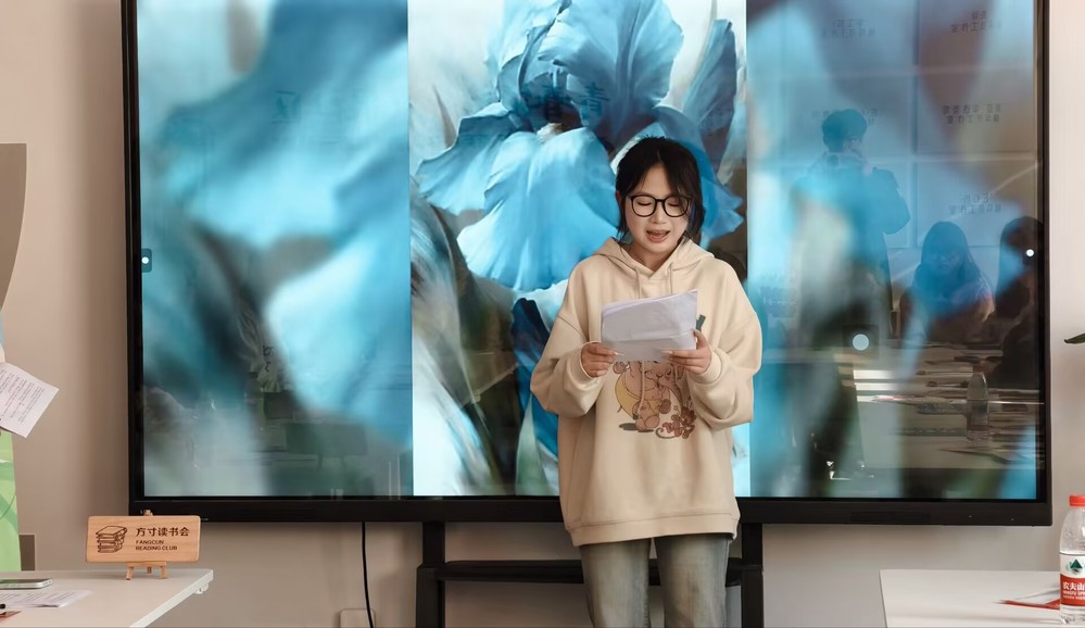 在经典朗诵环节,朱乐同学带来朦胧诗经典《会唱歌的鸢尾花》朗诵。她以温柔深情的语调,将诗歌中的个人情愫与时代使命巧妙相融,一字一句饱含情感,在悠扬诗意中传递出青年的温度与力量,声情并茂的演绎打动了现场每一位听众,赢得了阵阵热烈掌声。朗诵环节以声传情、以诗明志,让大家在文学韵律中感受文字之美,进一步厚植青春理想。