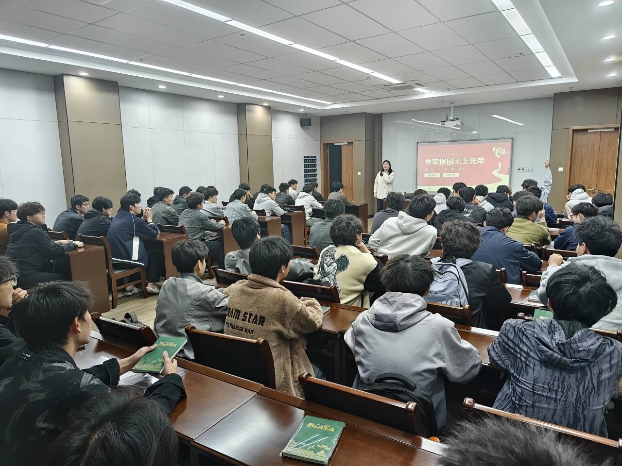 活动中,学生处征兵办公室负责老师结合自身工作经历,以鲜活的事例和真挚的情感,生动讲述了参军入伍带来的成长蜕变与人生机遇。从广阔的发展前景到优厚的政策保障,从意志品格的磨砺到家国情怀的升华,通过这次讲解让同学们对军人这个职业有了更深刻的认识和理解。