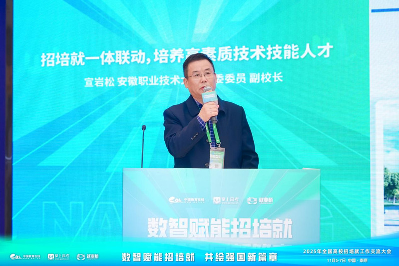 2025年11月5日至7日,由中国教育在线主办的2025年全国高校招培就工作交流大会在南京隆重举行。本次大会以“数智赋能招培就共绘强国新篇章”为主题,汇聚全国各省市教育主管部门相关负责人、800余所高校的招生、就业、教务工作负责人及教育界专家学者共1500余人,共商数智化助力高校人才建设与高质量发展实践探索。学校党委委员、副校长宣岩松受邀作《招培就一体联动,培养高素质技术技能人才》专题报告。