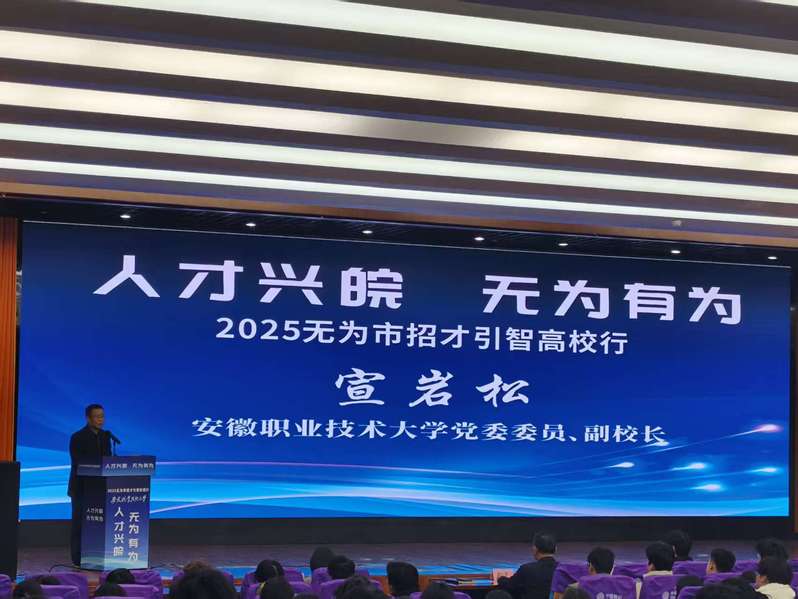 宣岩松代表学校对刘求标一行的到来表示欢迎,并介绍了学校的办学历史、人才培养特色和建校七十年来取得的成绩。他高度评价无为市作为皖江腹地新兴城市的活力与潜力,肯定其“电食羽新”四大支柱产业发展成效及人才工作战略定位,回顾双方在学生实践、就业、产业发展等方面的良好合作基础。最后,提出三点期望:一是希望以此次活动为契机,进一步推动我校与无为市建立更加紧密的合作机制,努力共建一批产业学院、实训基地,实现资源共享、优势互补;二是希望各位企业家多向同学们展示无为的发展机遇和岗位魅力,积极吸纳更多安职大学子到无为市创新创业,实现“企业得人才、学子得机遇、地方得发展”的共赢局面;三是希望同学们好好珍惜此次宝贵机会,主动了解无为、选择无为,把个人理想融入地方发展大局,在“无为有为”的实践中书写青春华章。