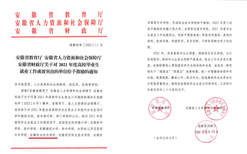 学院主动对接安徽十大战略新兴产业,优化专业结构,对接市场需求。近年来,招生就业“进出两旺”。2021年学院文理科录取分数线及排名在全省同类院校中继续领先;21届毕业生就业率达97.6%,其中就业专业对口率达65%,留肥率61%、留皖率75%。学院荣获2021年度全省高校毕业生就业工作成效突出单位激励。