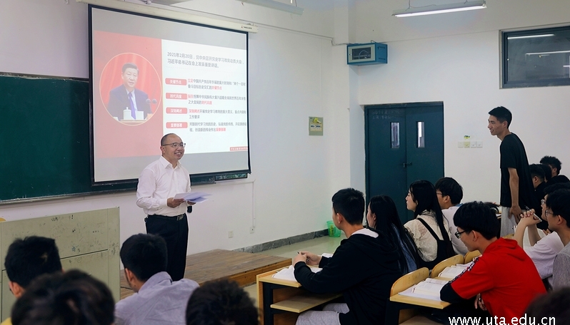 本网讯(宣传部通讯员 许晓婷 黄学文)为深入贯彻落实习近平总书记在党史学习教育动员大会上的重要讲话精神,结合我校大一学生正在学习的《概论》课程,5月18日下午,省委宣讲团成员、党委书记李方泽在教学楼B楼403教室为我校建筑工程学院装饰专业2021、2022班学生上了一场生动的思政课。