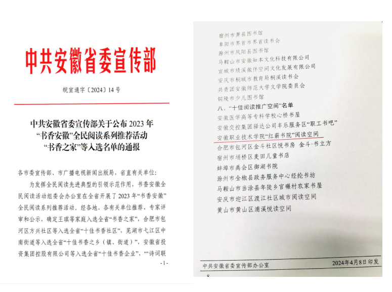 本网讯(党委宣传部通讯员 胡骏 公共管理学院通讯员 周安琪 杨淑涵)近日,省委宣传部公布《2023年“书香安徽”全民阅读系列推荐活动入选名单》,我院“红薪书院”阅读空间荣获全省“十佳阅读推广空间”。