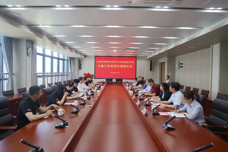 柯黎颖代表长鑫存储对学院的热情接待和大力支持表示感谢。柯黎颖表示,随着长鑫存储的不断发展,公司对应用型人才的需求也日益旺盛,安徽职业技术学院作为培养专业技术技能人才的重要基地,一直以来都承担着为社会输送高素质技术技能人才的重要使命,双方的合作具有很强的一致性。本次订单班的开设,更是双方深化校企合作的重要举措。柯黎颖希望通过校企双方的共同努力,搭建更好的校企合作平台,全面深化产教融合,不断培养优秀专业人才。赵国胜简要介绍了长鑫存储的发展历程、公司规模、企业愿景、企业文化与人才培养,希望经过双方的共同培养,结合长鑫存储文化的熏陶,推进订单班建设取得成功。