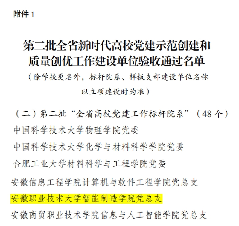 (党委组织部)近日,省委教育工委公布了第二批全省新时代高校党建示范创建和质量创优等建设单位验收结果。我校智能制造学院党总支、公共管理学院社区公益教研室党支部、环境与生命健康学院化工教研室党支部、计算机与信息技术学院电子通信学生党支部、机关党委学生处团委党支部、公共管理学院社区公益管理教师党支部朱凤丽工作室等6个党建“双创”建设单位顺利通过验收。