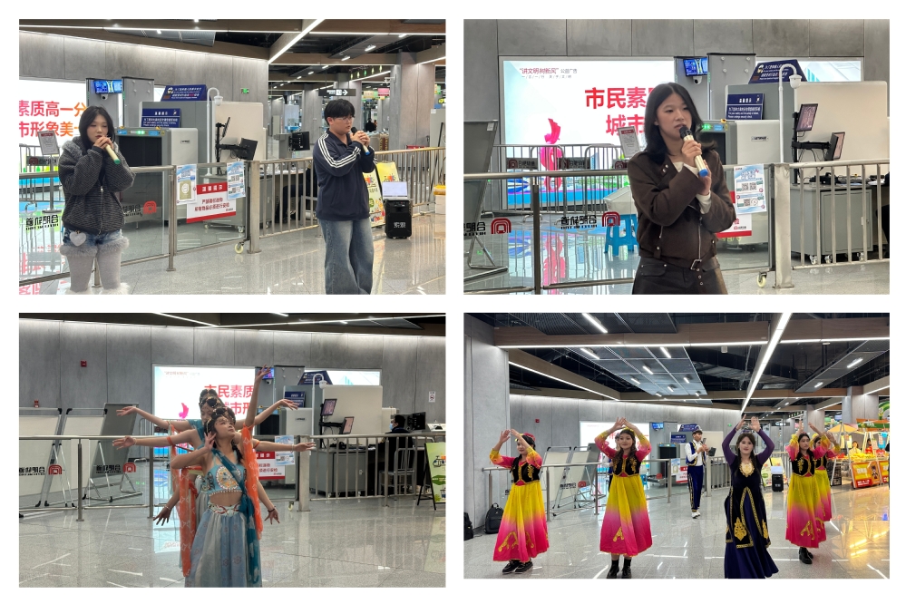 活动现场,同学们表演了丰富多样的节目。从《绽放》《阳光宅男》等充满青春活力的流行歌曲,到《遇上你之前的我》《永不失联的爱》等温情合唱,再到精彩的新疆民族舞蹈与国风舞蹈《伽陵频伽》,一个个节目接连上演。列车进出站的广播与屏蔽门开合的声响,与表演自然融合,形成了独特的现场效果。不少乘客放缓脚步,驻足聆听,有的随节奏轻轻点头,有的用手机记录下这特别的一刻。