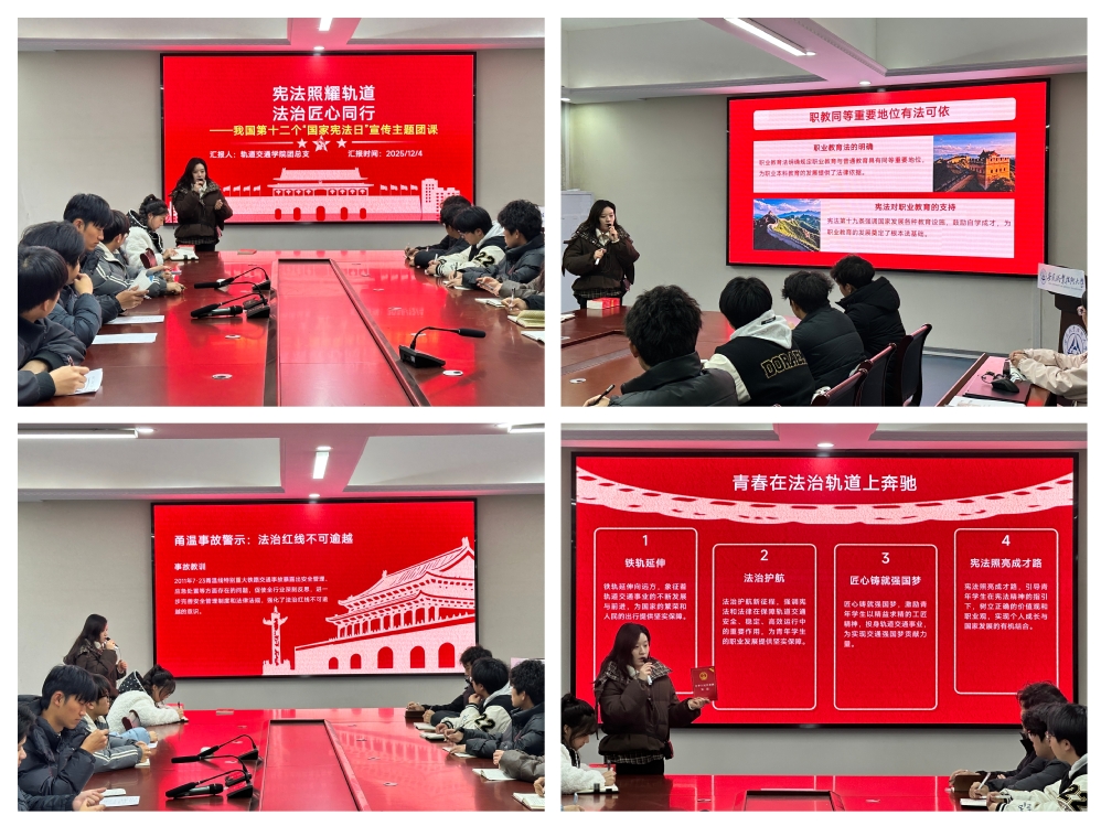 团课紧扣“宪法精神”“职业本科教育”“轨道交通行业”“团学工作”四个维度展开,阐释了宪法作为新时代法治基石的重大意义与最新精神,解读了职业教育在国家法治框架下的战略地位,强调了“德技并修”中法治素养的核心价值。结合轨道交通行业“国民大动脉”的战略定位,通过行业典型案例,剖析安全、规则、责任、程序意识对从业者的重要性。最后,团课对团学组织及团干部在宪法学习宣传中的职责使命提出明确要求,号召团支书带头将宪法精神融入支部活动,设计具有专业特色的法治实践,引领广大团员青年争做行业法治素养的先行者。
