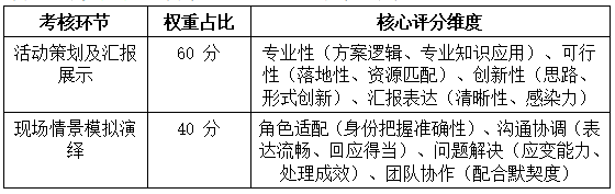 竞赛形式:采用“封闭策划+面试汇报+小组情景演绎”结合的形式,核心测试学生的专业素养、活动策划能力、沟通表达能力、情境应变能力、团队协作能力及知识理论的落地应用能力,全程由参赛选手独立完成相关环节(情景模拟为小组协作但单独评分),指导老师不得干预。