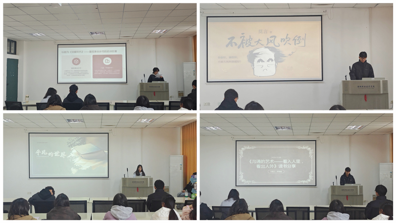 四位分享人围绕主题依次分享读书感悟。HR25本科班陈俊霖同学解读《觉醒年代》中的理想之光与使命传承,带领师生重温革命先辈的初心使命;HR2421班王娜同学结合《平凡的世界》,讲述平凡个体在时代浪潮中的坚守与奋斗;公益2421班徐龙同学分享《不被大风吹倒》的阅读体会,探讨逆境中成长的韧性力量;HR2421班周雪逸同学以《沟通的艺术》为切入点,分析有效沟通在个人发展与社会协作中的重要价值。四位分享者的发言真挚深刻,引发在场师生强烈共鸣。