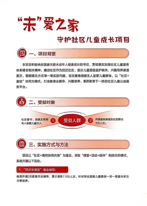磨店社区部分儿童长期面临“监护缺失、兴趣培养渠道匮乏、假期生活单调”的现实困境多数双职工家庭子女放学后无人照看缺乏课业指导瞄准这一痛点,蒲公英社会工作协会以守护未成年人健康成长为核心,联合磨店社区启动“未爱之家”项目,构建起“社区 + 高校”协同共育的公益服务体系,为20名留守、困境及假期无人监管儿童搭建起集课业辅导、兴趣培养、素质教育于一体的成长平台。项目落地以来,在学院指导的专业框架下,志愿者们以每周2次的“四点半课堂”为基础,累计开展 1100 人次的儿童家庭作业辅导,针对学业困难制定一对一答疑学习习惯培养方案,帮助多名孩子改善了学习状态;每学期策划3场传统文化体验、手工实践、科普实践等素质拓展活动,让孩子们在趣味互动中开阔视野;每月融入安全教育、社会责任、传统礼仪等主题教育,将品德培育融入日常陪伴,逐步提升儿童的综合素养。