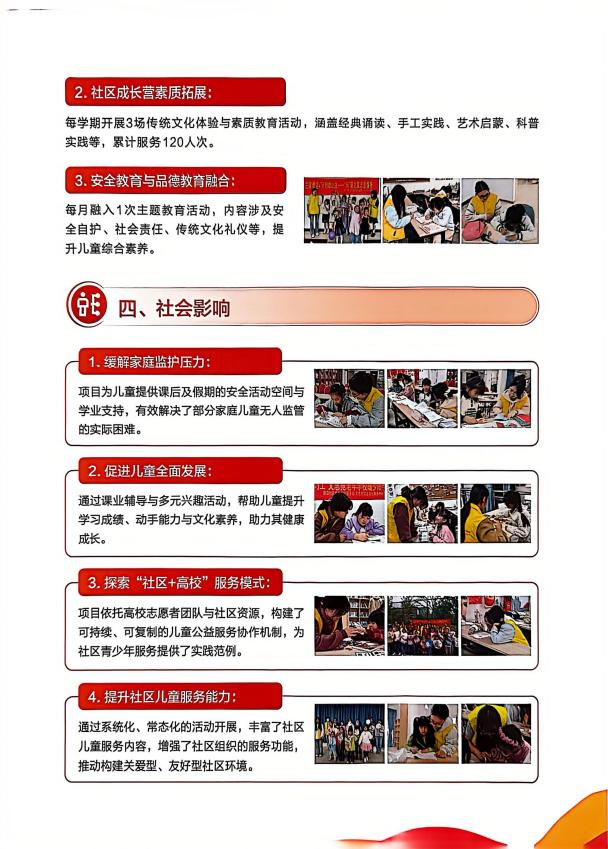 此次荣誉的取得,离不开学院的专业赋能与悉心指导。学院始终坚持将专业教学与社会实践相结合,鼓励师生积极投身社区服务,通过指导此类项目,既为学生搭建了实践锻炼的平台,也将高校的智力资源与专业优势转化为服务社会的实际效能。“未爱之家” 项目的成功,不仅缓解了双职工家庭的照护压力,助力儿童在陪伴中实现全面成长,更在学院的引领下,探索出高校专业力量和社区资源联动的可持续服务模式,为社区青少年服务提供了可复制的实践范本。(文/虞婧 图/朱畅、余晓冉