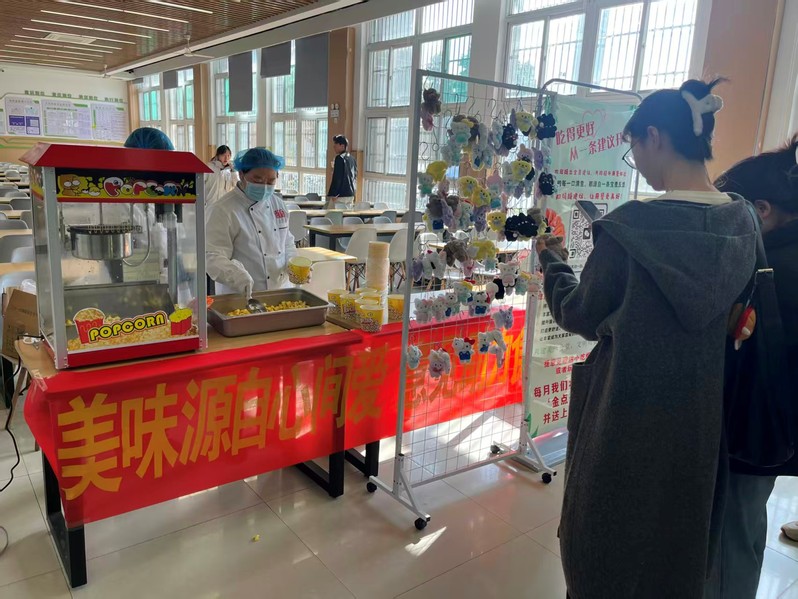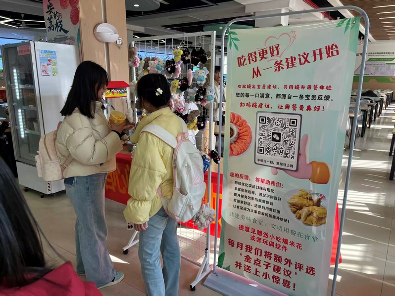 餐厅入口的意见征集点前,师生们络绎不绝。大家分别扫码填写建议。早餐希望增加杂粮选项”“窗口打饭速度可以再提一提,一张张卡片上,字里行间满是对餐厅的期待。提交建议后,同学们挑选着可爱挂件,或领取刚出锅的爆米花,奶油与谷物的香气在空气中弥漫。
