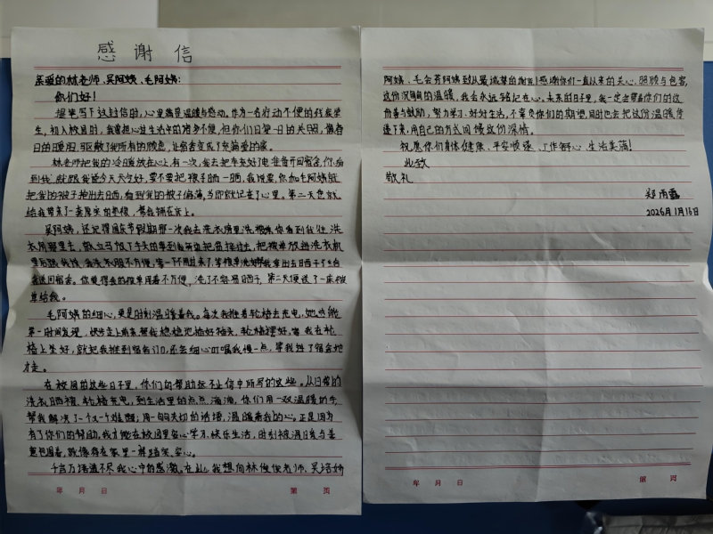 郑同学说:“正是因为有了你们的帮助,我才能在校园里安心学习、快乐生活,时刻被温暖与善意包围着,就像待在家里一样踏实、安心。”