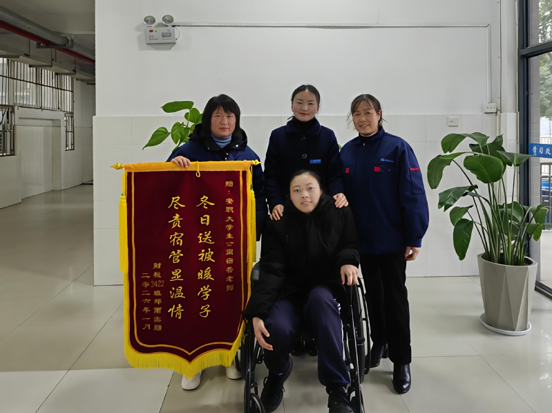 这面锦旗的背后,是一封同样情真意切的感谢信和一连串温暖人心的故事:郑同学是一名行动不便的学生,初入校园时曾对独立生活感到担忧。然而,我们员工的善举打消了她的全部顾虑,让她感受到家一般的温暖。两位门岗阿姨在洗衣房看到她行动不便,不仅全程帮忙清洗、晾晒,更在事后贴心地为她换上了一床更方便使用的新被单;代步车充电时,都会第一时间上前帮忙,并安全将她送回宿舍,一句“慢一点”的叮嘱,充满了家人般的关怀。宿管林老师在帮助她晾晒被子时,细心发现被子偏薄,第二天便主动为她送来一套厚实的垫被并帮忙铺好。
