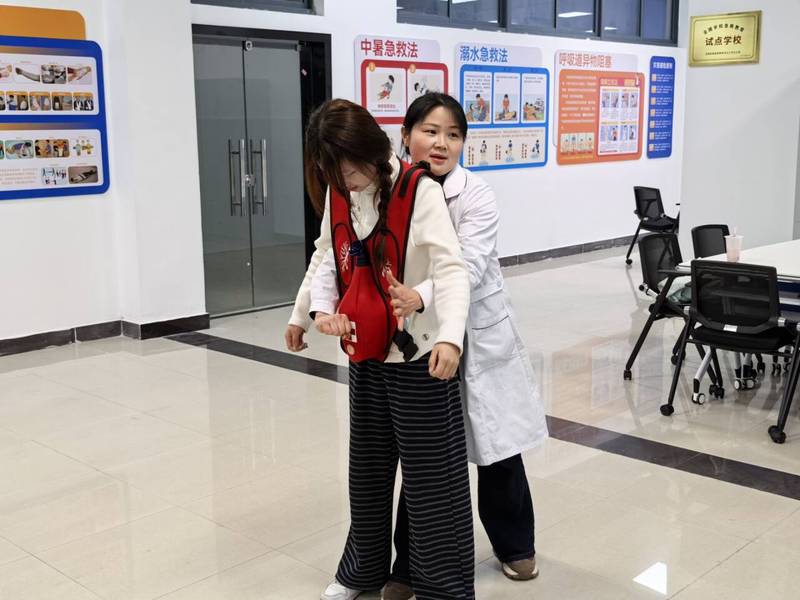 培训中,医师通过理论讲解与实操演示相结合的方式,系统介绍了心肺复苏的原理、操作流程、注意事项及气道异物梗阻时海姆立克急救法的规范手法。从判断患者意识、呼救、胸外按压到人工呼吸,逐一示范标准动作,并强调“黄金四分钟”的重要性。学生们认真聆听,积极参与实操练习,在医师指导下分组进行模拟演练,从胸外按压的深度频率,到“剪刀、石头、布”的冲击位置,逐一练习过关。