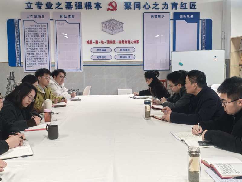 会上,孙波对工作室创立的前期筹备工作进行了总结,并系统阐述了工作室的建设目标与运行理念。工作室聚焦“红色工匠”培育主题,通过“思想筑基、纪律强梁、先锋立柱、模范筑顶”四项行动,积极探索“党建+专业+思政”深度融合的有效路径,着力构建起“地基—梁—柱—顶”四位一体的思想政治育人体系,为培养兼具家国情怀、专业素养与工匠精神的时代新人提供坚实支撑。工作室以“砼”为核心标识,既呼应专业之根基,又寓意团队“同心同德、凝心聚力”的精神内涵。工作室建设始终坚持理论研究与实践探索相结合、辅导员成长与学生发展相结合,聚焦辅导员主责主业,扎实推进精准思政与全方位育人。