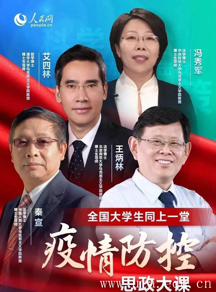 此次疫情防控思政大课邀请了清华大学艾四林、中国人民大学秦宣、北京师范大学王炳林、中央财经大学冯秀军四位教授,结合高校思想政治理论课内容,解读了以习近平同志为核心的党中央关于疫情防控的决策部署,分析了肺炎疫情之下所彰显的中国共产党和中国特色社会主义制度的显著优势,总结了中华民族从磨难中奋起、化危机为转机的历史经验和智慧,讲述了疫情中勇敢逆行的中国青年故事,凸显了思想政治理论课在高校立德树人工作中的关键作用。