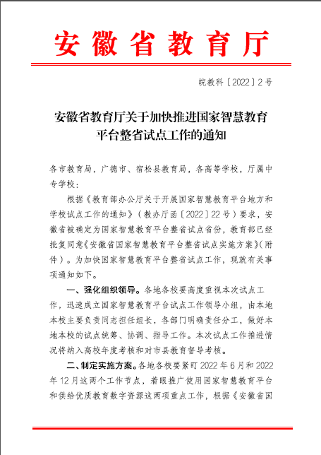 2022年学院被列为安徽省“国家智慧教育平台重点试点学校”