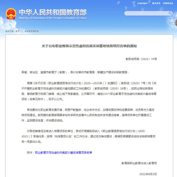 2021年,被列入职业教育示范性虚拟仿真实训基地培育项目