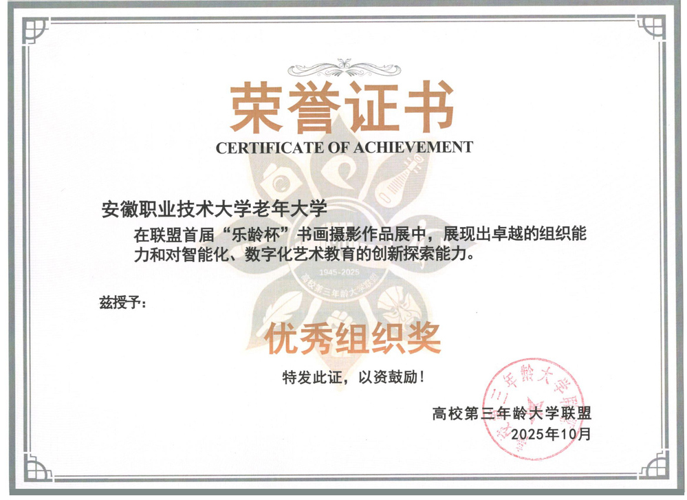 为纪念中国人民抗日战争暨世界反法西斯战争胜利80周年,高校第三年龄大学联盟精心举办首届“乐龄杯”书画摄影作品展,以艺术为桥,铭记历史记忆,传承文化薪火,彰显老年教育丰硕成果。我校积极响应联盟号召全力参与,凭借扎实的组织工作与优质的作品报送荣获“优秀组织奖”。