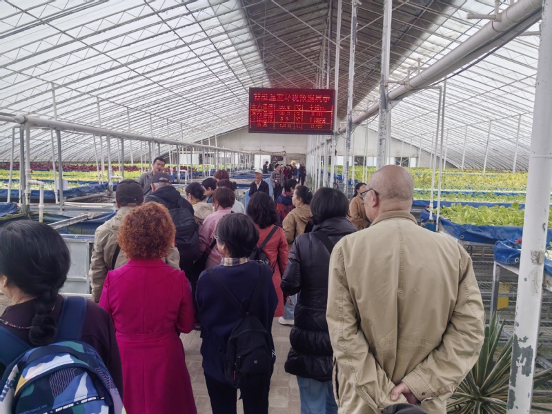 在农业科技园区,老同志们分为四组在解说员的带领下参观了三个农业科普馆。大家在热带果林棚中,观察了具有常绿肉质特征的热带荒漠植物、叶小而树干粗大的热带草原植物以及热带雨林植被;在智慧农业棚中参观了“鱼菜共生系统”的工作路径,水循环利用等;在蔬菜基地参观了无土栽培、全自动立体水培等各种科技感十足的现代农业栽培技术。园区的智慧农业管理系统、水肥一体化系统、物联网监测等设施,让老同志们见证了现代科技的应用场景,感受到了“饭碗端在自己手里”的信心和力量。