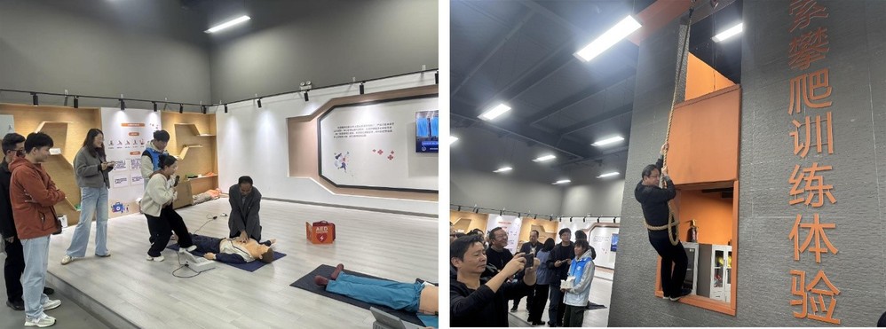 在应急救援实训中心,借助心肺复苏模拟人,讲解员详细讲解了心肺复苏急救技术的关键要点,党员干部们现场实操心肺复苏术的急救方法,亲身体验攀爬训练、结绳操作等项目,深入了解消防救援基础技能,并在应急装备区直观感受应急检测、营救、通讯等各类应急装备的功能与使用方法,党员干部的应急和急救技能得到进一步提升。