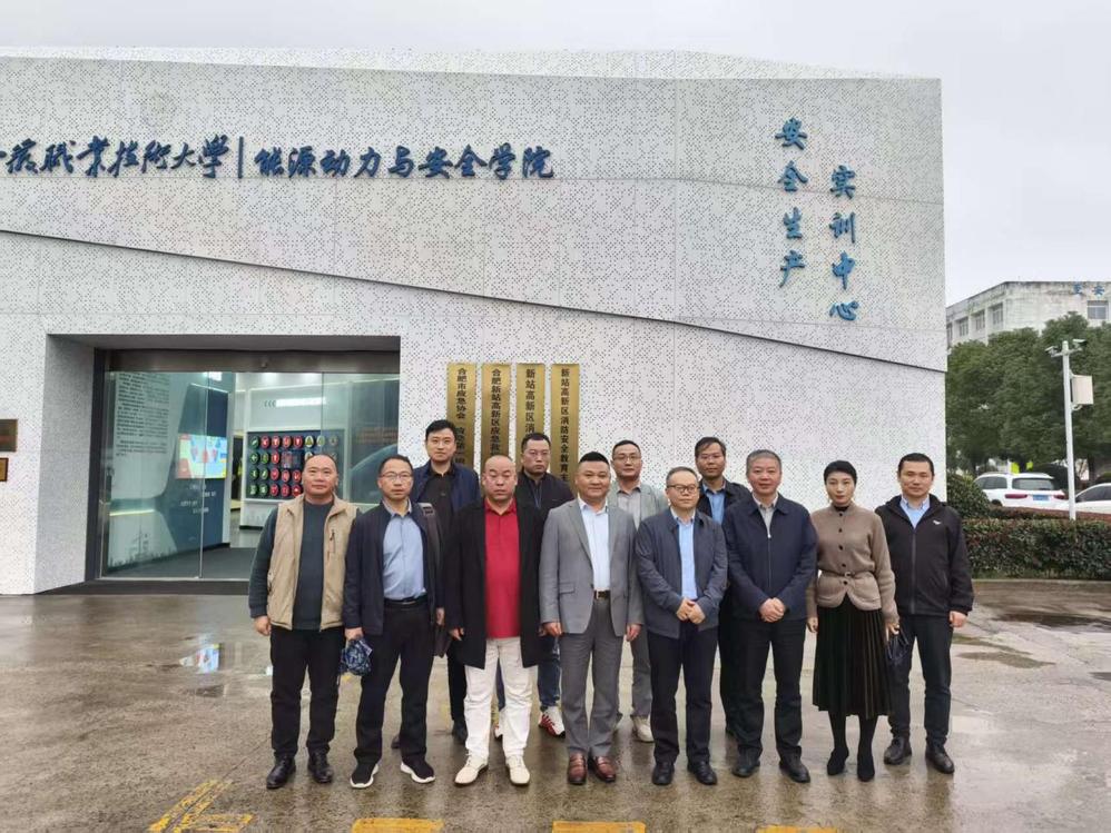 与会双方就进一步深化产教融合、校企合作,创新人才培养模式,探索党建引领下协同育人的新路径进行了深入交流。在与会人员的共同见证下,盛鹏与张之伟携手为合肥市阜阳商会安全培训基地隆重揭牌。会后,来宾一行参观了校园及安全生产实训中心并合影留念。