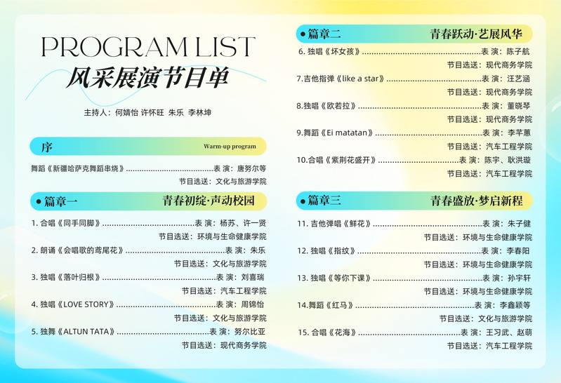 现代商务学院学子接连登场,独唱《坏女孩》《欧若拉》飒爽与空灵并存,吉他指弹《like a star》弦音轻跃,勾勒出青春的星辰大海;汽车工程学院的舞蹈《Ei matatan》活力四射,合唱《紫荆花盛开》以磅礴和声寄寓家国情怀,将现场推向高潮。