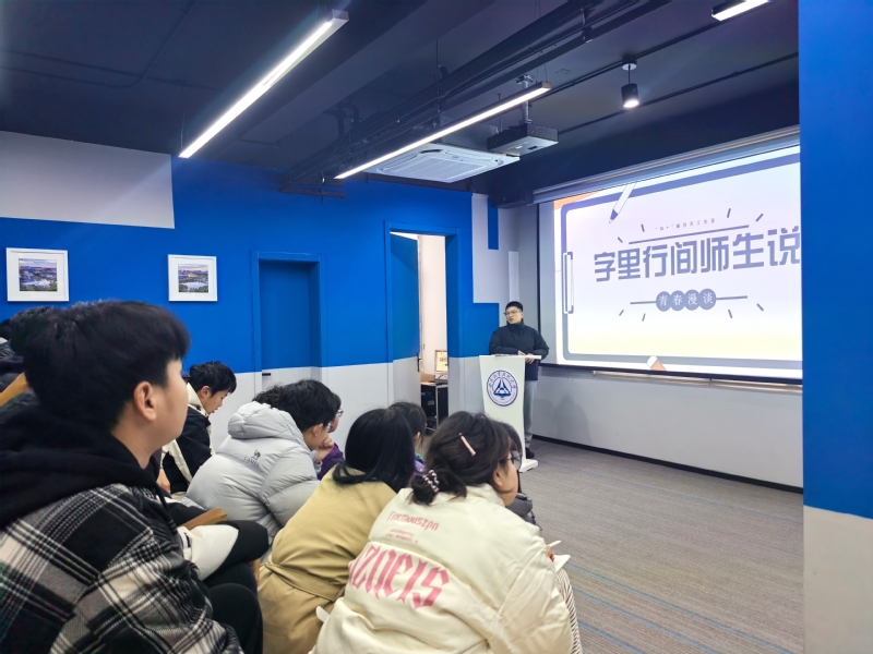 本期活动由工作室主持人李宏林主讲,他先介绍了“字里行间师生说”的活动背景和意义,并以“路”为主题词向现场师生分享了自己跨城区骑行路上的曲折故事和十年求学求职路上的真实经历。通过自身经历和成长路上的点点滴滴,激励同学们正确认识前途是光明的、道路是曲折的,要敢于自我革命,直面生活学习中的困难和挫折,体验成长路上的成功和失败,仰望星空、脚踏实地,走好每一步,用汗水浇灌才能一路生花。