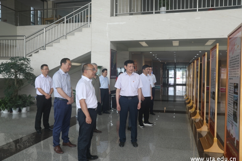 6月30日上午,在党委书记李方泽的带领下,党委领导班子成员一行六人来到图书馆一楼大厅参观了“胸怀千秋伟业 恰是百年风华”党史图片展,图书馆副馆长汪武就开展此次党史图片展活动做了详细讲解。