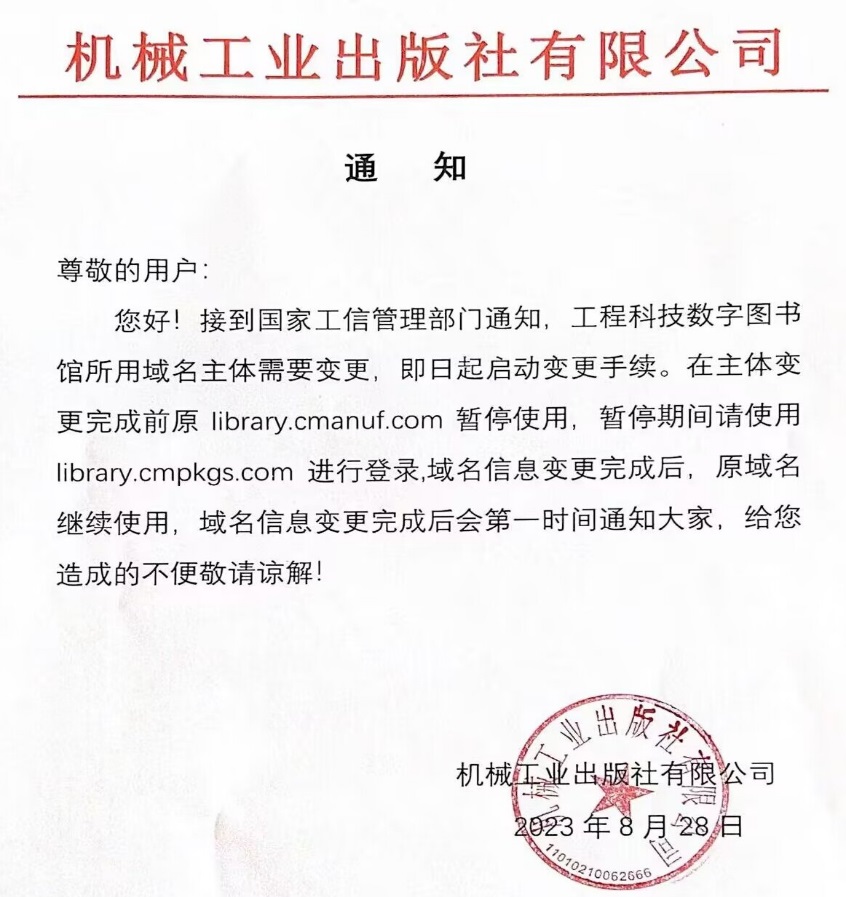 接到“工程科技数字图书馆”供应商的通知,其所用域名主体需要变更,原地址暂停使用,暂停期间请使用library.cmpkgs.com进行登录,域名信息变更完后,原域名http://library.cmanuf.com继续使用,域名信息变更完成后会第一时间通知大家,给您造成的不便敬请谅解。