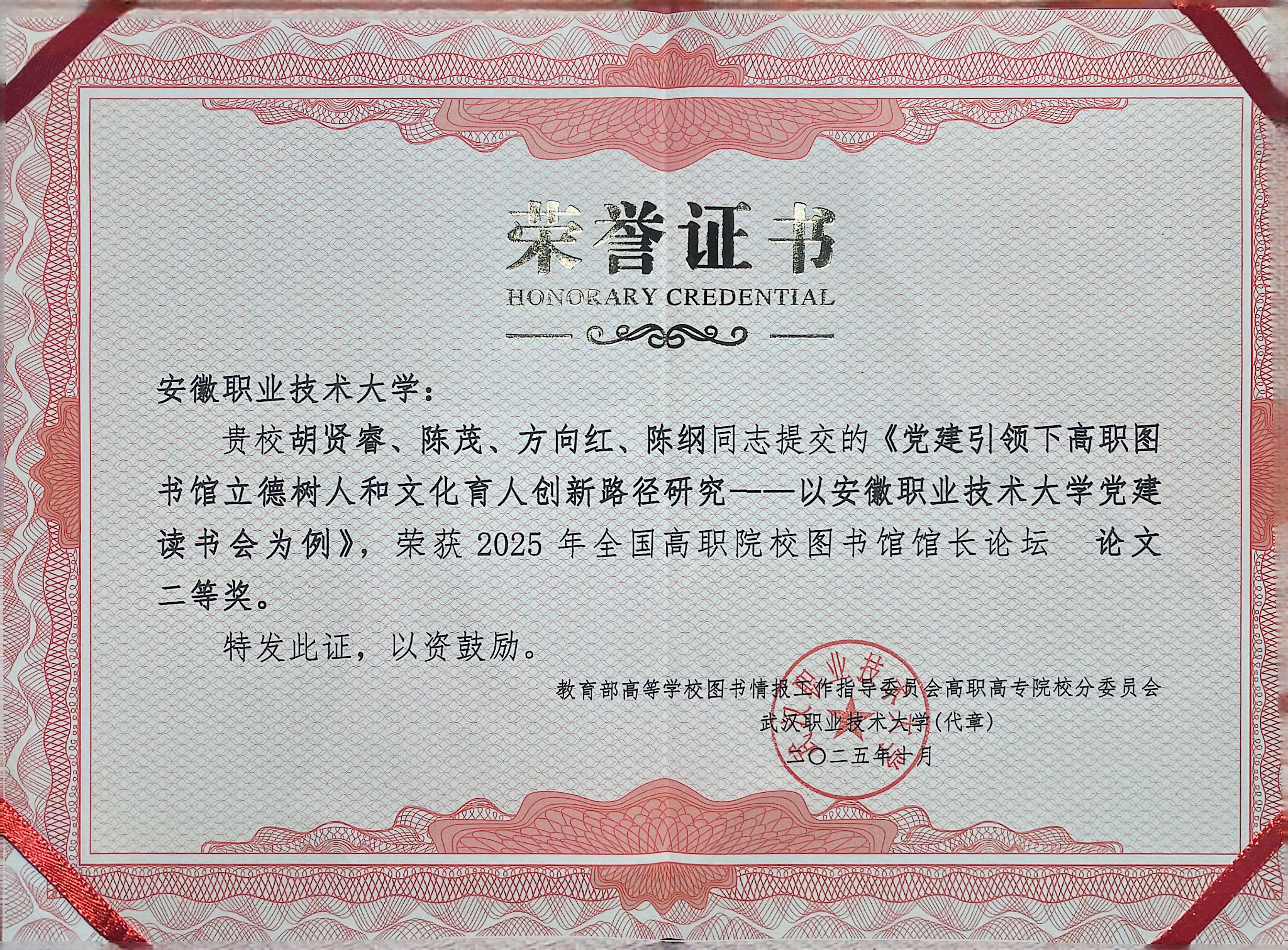 胡贤睿、陈茂、方向红、陈纲报送的《党建引领下高职图书馆立德树人和文化育人创新路径研究—以安徽职业技术大学党建读书会为例》一文,以我校特色品牌活动“党建读书会”为鲜活样本,系统总结和提炼了图书馆如何将党建工作与立德树人根本任务深度融合的创新经验。论文详细阐述了我校通过打造“党建+阅读”品牌,构建文化育人新高地的具体路径、实施方法与显著成效,为全国同类院校图书馆提供了可复制、可推广的“安职大经验”,展现了高校基层党建与业务工作同频共振的强大生命力。