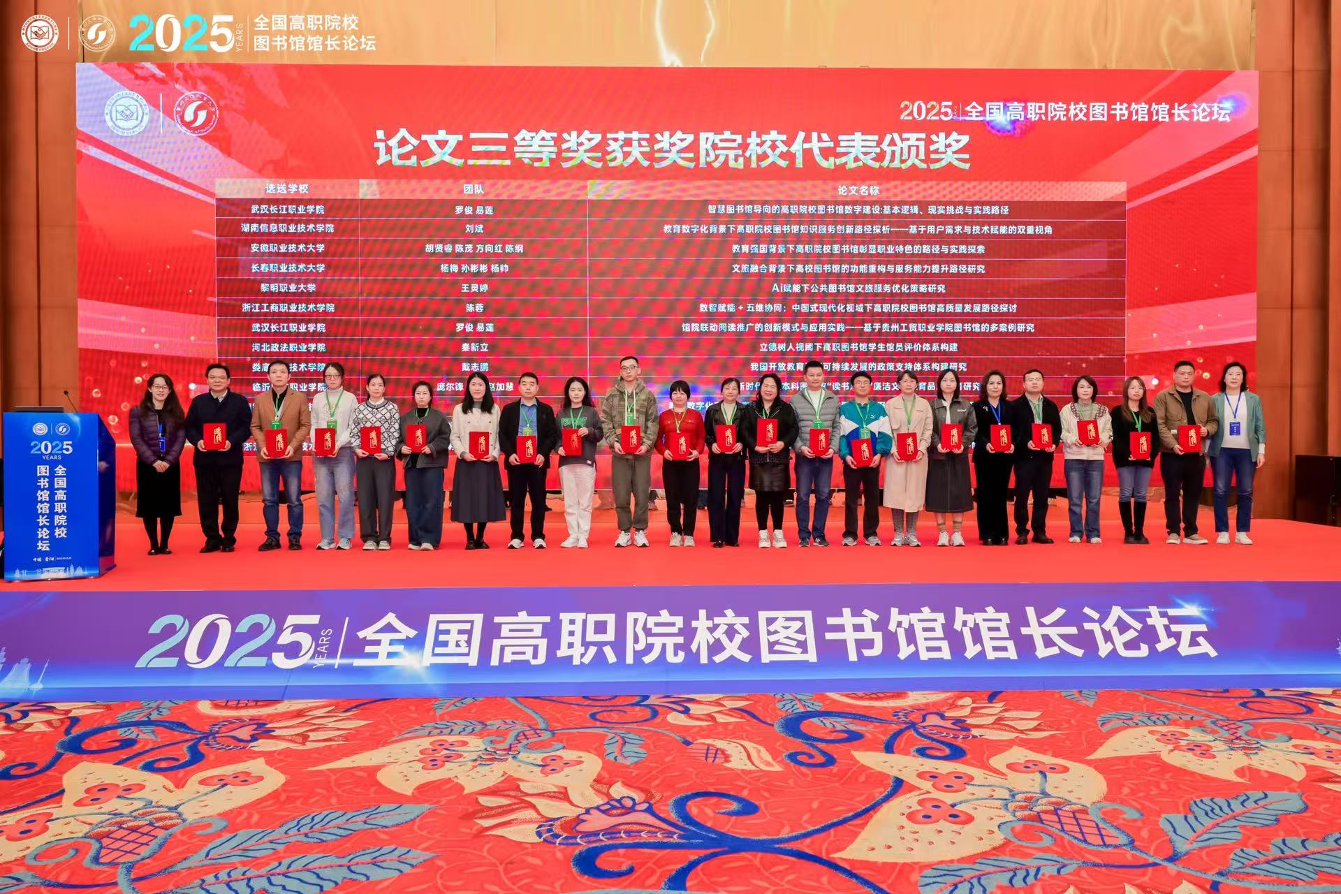 10月22日,由教育部高等学校图书情报工作指导委员会高职高专院校分委员会主办的全国高职院校图书馆馆长论坛在贵阳隆重召开。我校图书馆报送的《党建引领下高职图书馆立德树人和文化育人创新路径研究—以安徽职业技术大学党建读书会为例》在论文征集活动中荣获二等奖,《教育强国背景下高职院校图书馆彰显职业特色的路径与实践探索》荣获三等奖,获奖老师在大会上接受表彰。