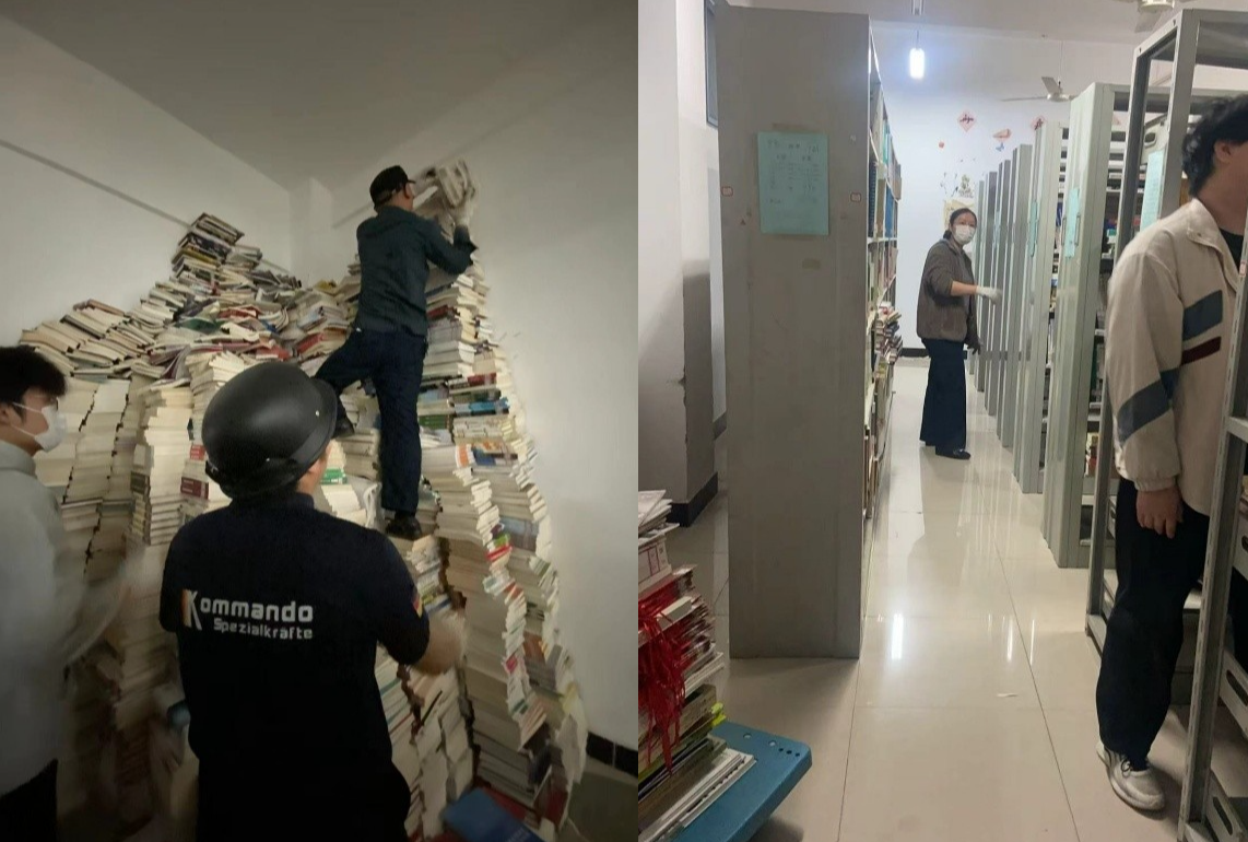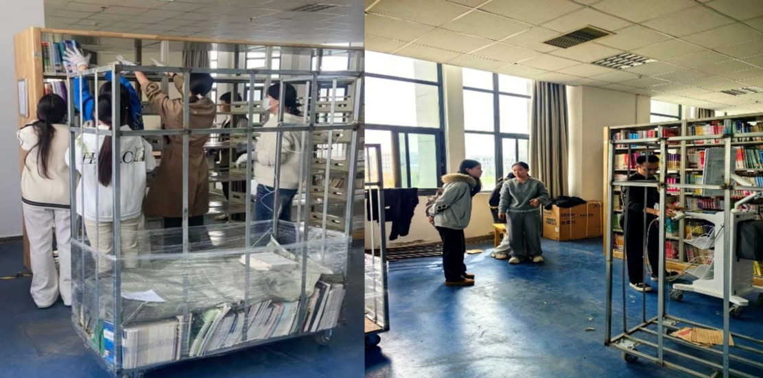 在图书馆典藏(一二)书库的工作中,图书馆老师通过现场指导,学生团队以科学流畅的“流水线式”作业,将图书馆典藏(一二)书库内铁制书架上的书籍调整至图书馆环境优化项目前期准备好的木质包边书架上。