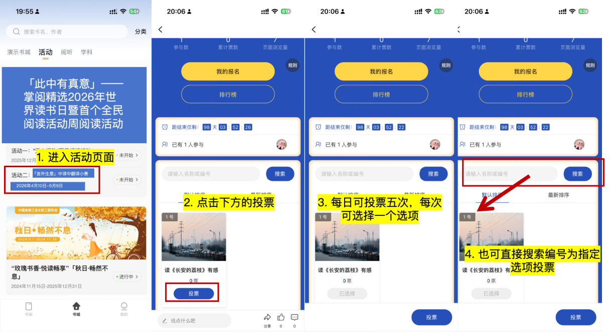 阅读推荐书单或掌阅精选书城内任意电子书,每日阅读满20分钟即可。
