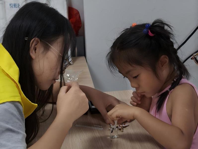 活动开始前,志愿者们已精心布置好场地,彩色贝壳片、安全剪刀、专用粘胶以及各类首饰基底整齐排列。活动中,志愿者通过实物展示与图片讲解,生动介绍了螺钿工艺的历史渊源与发展。孩子们亲手触摸贝壳材质,眼中闪烁着好奇与期待。手工制作环节,孩子们专注地将修剪好的贝壳片粘贴到首饰底座上。志愿者以引导代替代劳,鼓励孩子们独立思考和调整。活动现场氛围温馨而有序,剪刀轻响间,,不时传来孩子们的惊叹与交流。不少孩子还发挥创意,在贝壳边缘添加彩绘装饰;彼此协作、共享材料的场景更是屡见不鲜。活动尾声,孩子们自豪地展示各自完成的作品,获得了家长们的连连称赞。