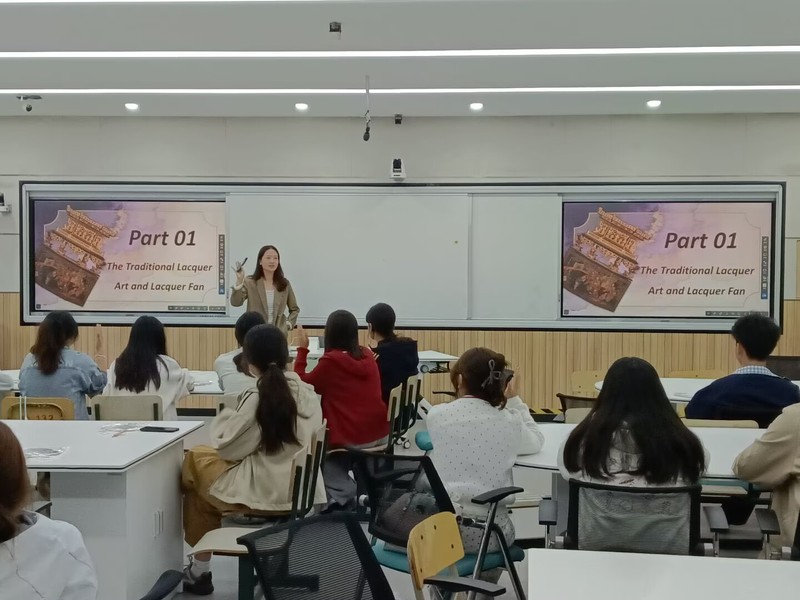 活动伊始,薛老师以全英文讲解的形式,系统梳理了漆艺与漆扇的渊源、历史发展脉络。从古代漆扇在宫廷与民间的不同应用,到清代作为文化名片远销欧洲的辉煌,老师通过丰富的图片与生动的案例,让大家对漆扇的文化价值有了立体认知。