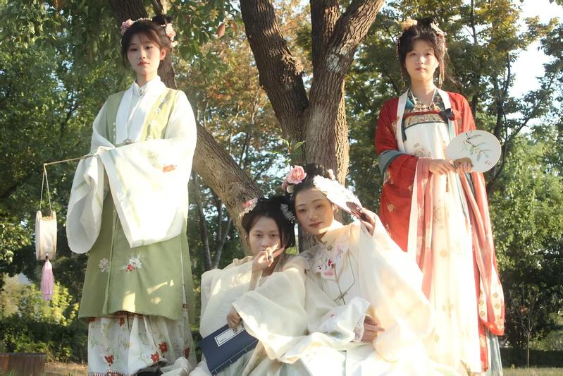 拍摄现场,汉服与秋景相映成趣。教学楼前的银杏树下,身着曲裾深衣的成员手持折扇,吟诵霜叶红于二月花,镜头定格下诗文与实景交融的瞬间;清水湖畔,穿齐胸襦裙的同学轻捧陶罐模拟汲水藏冬,呼应霜降储物备冬的农事传统;还有人手持柿子道具,演绎霜降吃柿,不会流鼻涕的民俗佳话,笑声随秋风飘散。成员们分工协作,有人负责场景设计,有人调控拍摄角度,有人补充节气细节,将霜降的物候特征、民俗风情通过镜头语言生动呈现。