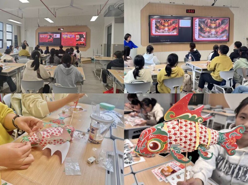 手工体验环节中,学生们围绕课桌,对照预制材料包与步骤说明,动手组装鱼灯:从拼接鱼身骨架、粘贴纹样装饰,到整理鱼鳍、鱼尾的细节造型,大家专注操作,不时互相交流技巧。当色彩艳丽、纹样精美的鱼灯逐渐成型时,现场洋溢着成就感与传统文化共鸣的氛围。