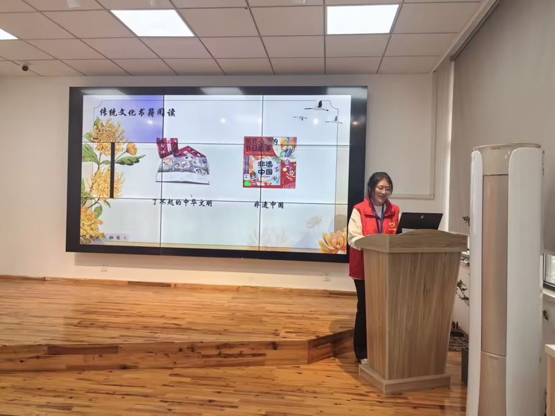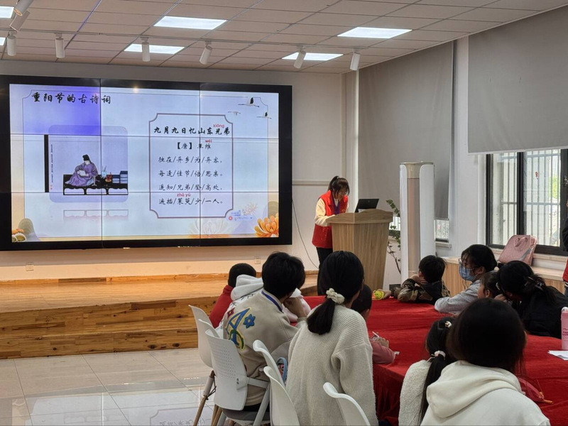 互动环节内容丰富,以“青春年少好读书”为主题,涵盖经典诵读、书籍推介与知识答题三个板块。在诗词诵读环节,小朋友们齐声朗诵《九月九日忆山东兄弟》等经典诗作,在朗朗书声中体会古人的节日情怀,感受诗词中的深厚文化韵味。随后向小朋友们推荐了《了不起的中华民族》与《非遗中国》两本读物。前者以绘本形式解读中华习俗、艺术等文明成果,语言浅显易懂且配有国风插画;后者则涵盖传统节日等非遗项目,帮助大家从不同视角了解传统文化的传承价值。知识答题环节中,志愿者围绕重阳节历史、习俗、诗词等内容设计选择题与判断题,小朋友们踊跃举手抢答,在欢乐互动中巩固所学知识,深化对传统文化的理解与喜爱。