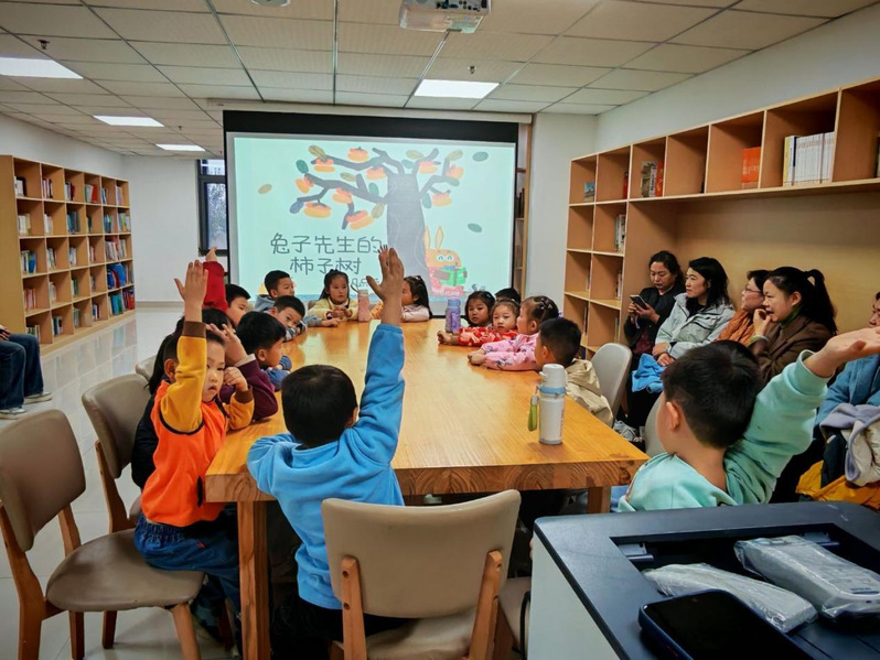 活动开始,志愿者为孩子们讲述了绘本故事《兔子先生的柿子树》。随着故事的展开,孩子们仿佛走进了兔子先生的果园,感受着柿子从开花、结果到分享的喜悦与温暖。生动的讲述配合互动提问,不仅牢牢抓住了孩子们的注意力,更激发了他们对自然、成长与分享的无限想象和情感共鸣,现场欢声笑语不断。