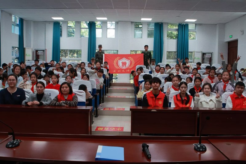 活动尾声,“迷彩先锋社”的旗帜在报告厅中央展开,师生与退役士兵大学生们合影留念,孩子们纷纷比出“剪刀手”,用笑容定格这场意义非凡的相遇。不少同学比出“点赞”手势,用稚嫩的方式表达对他们的敬意。